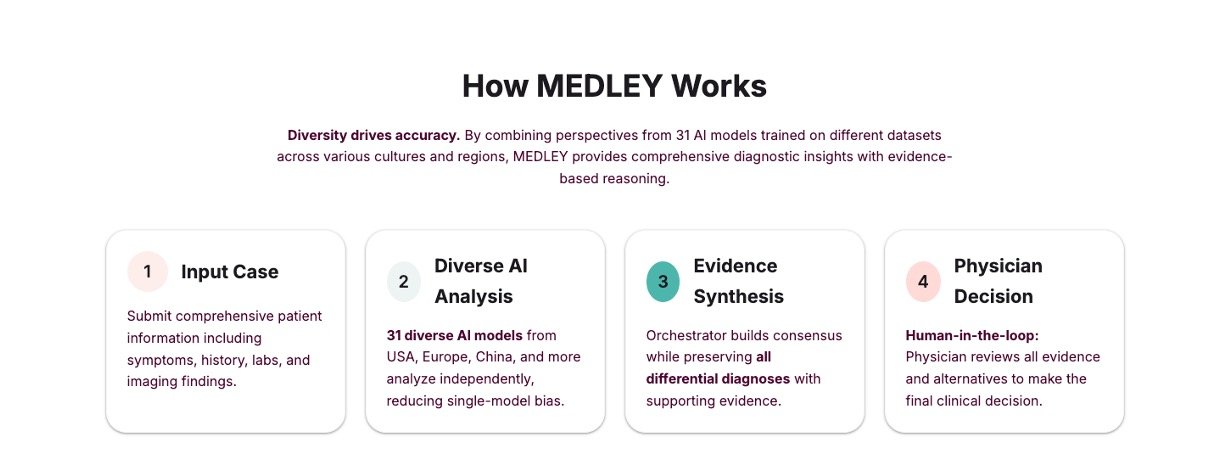 MEDLEY is a medical AI tool that boosts diagnostic accuracy by blending insights from 31 diverse AI models trained across cultures like the USA, Europe, and China. Users submit patient details such as symptoms, history, labs, and imaging, and the system analyzes them independently to cut down on biases from any single model. An orchestrator then synthesizes evidence into a consensus while keeping all possible diagnoses, letting doctors make the final call with full transparency.​