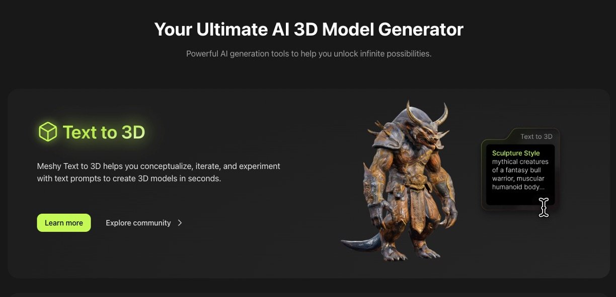 Meshy AI is a leading AI-powered 3D model generator designed to help creators—from game developers and digital artists to 3D printing enthusiasts—quickly transform text descriptions or images into detailed 3D models within seconds. It provides an intuitive, user-friendly platform that simplifies complex 3D modeling tasks, making professional-quality model creation accessible to users with little or no technical experience. In addition to generating 3D models, Meshy offers AI-driven texturing and animation features, allowing users to bring their creations to life effortlessly and integrate them seamlessly into their projects.