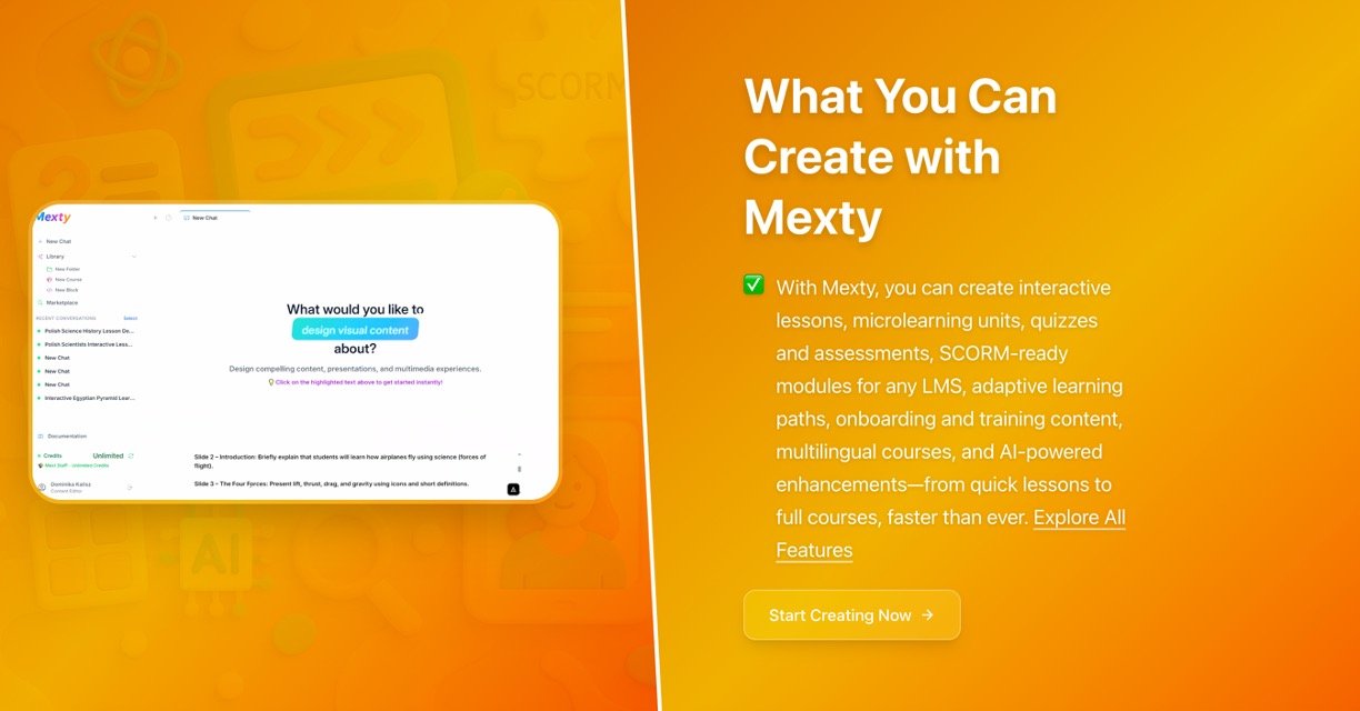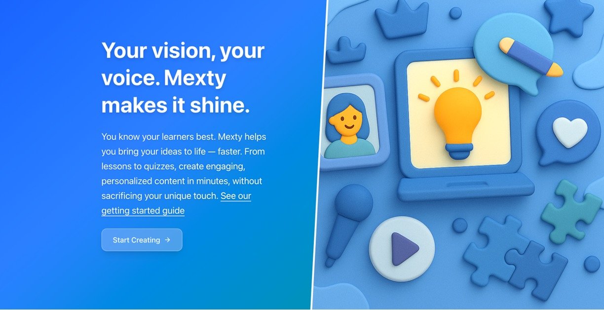 Mexty AI is an easy-to-use AI platform that lets teachers, trainers, and anyone creating learning content build personalized lessons, quizzes, and full courses in just minutes. No coding skills needed – simply describe your idea, and the AI handles the rest, turning it into engaging, interactive materials tailored to different learning styles like visual, audio, or hands-on. It saves tons of time while keeping your unique teaching voice, and you can even share or sell your creations in a community marketplace.