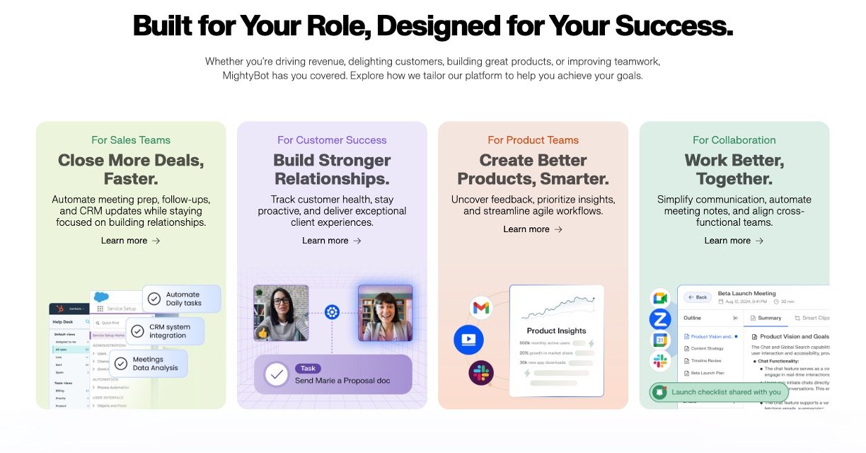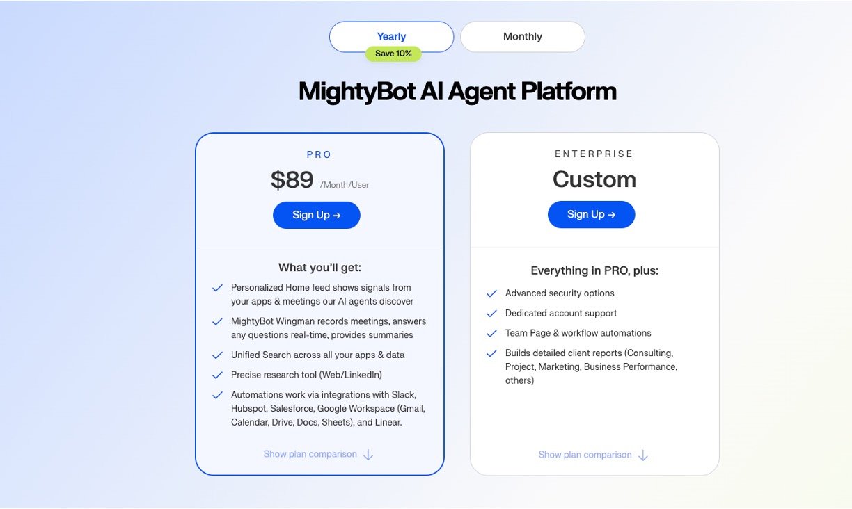 MightyBot is an AI-powered productivity platform designed to automate repetitive tasks, streamline workflows, and deliver actionable insights for teams and professionals. By integrating with popular tools like Slack, Google Workspace, and Salesforce, MightyBot handles everything from meeting prep and note-taking to CRM updates and customer relationship tracking. With its unified search and personal data index, MightyBot helps teams eliminate busywork, uncover key information quickly, and focus on high-value activities that drive results—making collaboration seamless and work more meaningful for everyone.