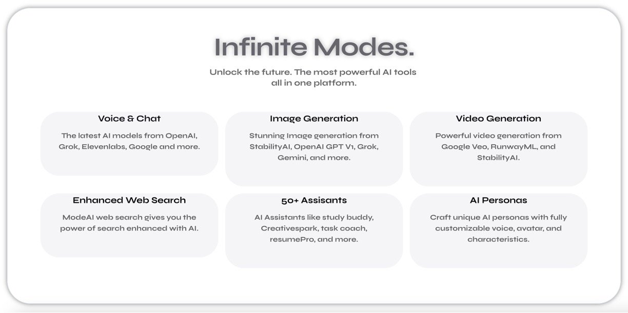 Mode AI is an all-in-one AI-powered creative platform that offers a vast suite of tools for content creation, AI web search, personal assistance, and text generation. The platform integrates the most powerful AI models from companies like OpenAI, Google, and StabilityAI to enable users to generate high-quality images, videos, text, and audio easily. It also features customizable AI personas, real-time voice and chat capabilities, and a collaborative community hub. Designed for entrepreneurs, creatives, educators, and teams, Mode AI helps visualize ideas faster, automate tasks, and enhance creativity with user-friendly and flexible tools accessible on mobile and web.