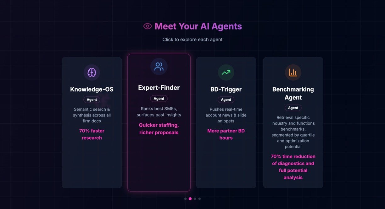 Consultant Onboarding: Accelerates ramp-up processes by automating knowledge gathering and training.