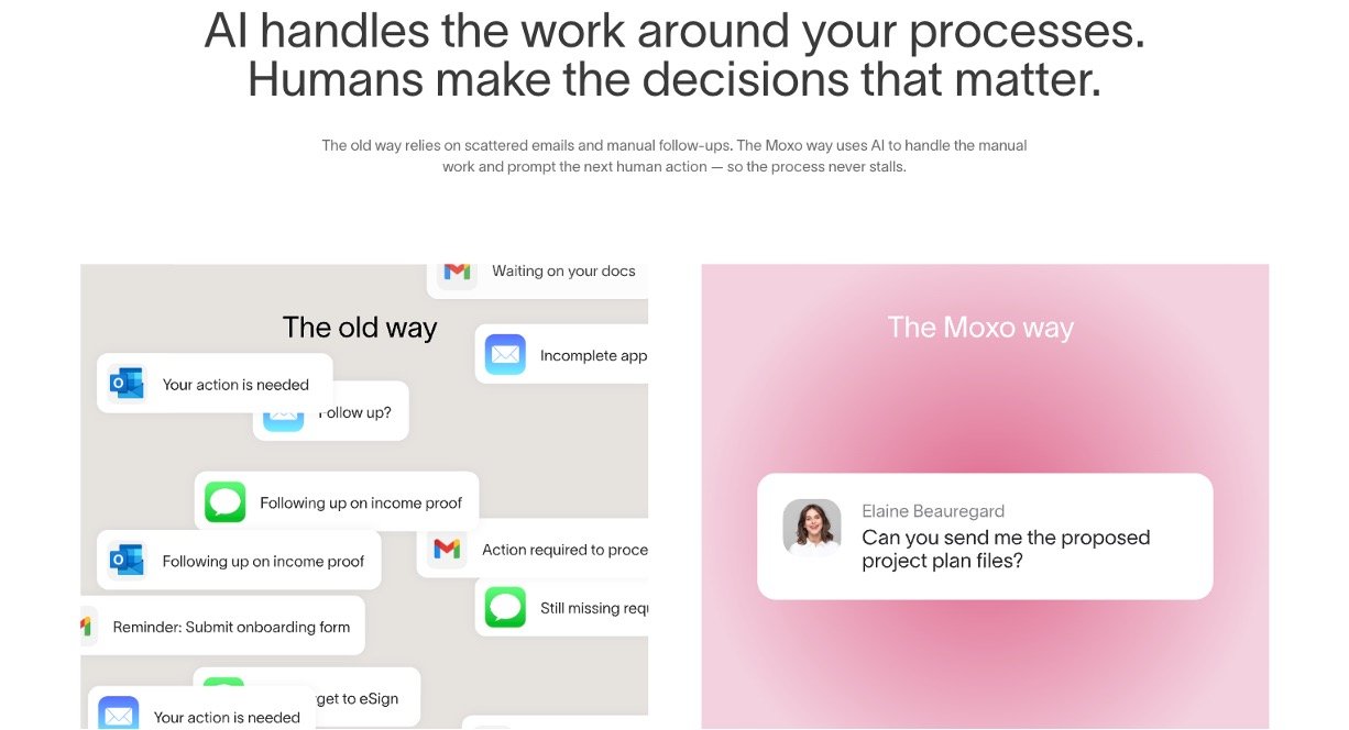 Moxo is a human-plus-AI orchestration platform that streamlines complex business processes by connecting people, systems, and AI in one place. It separates human judgment from repetitive tasks so that teams stay in control of decisions while AI agents handle preparation, validation, routing, and monitoring of work. This helps organizations move work forward faster, reduce manual follow-ups, and keep every step of a process clear and accountable for all stakeholders.