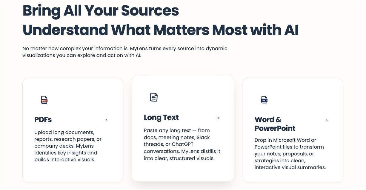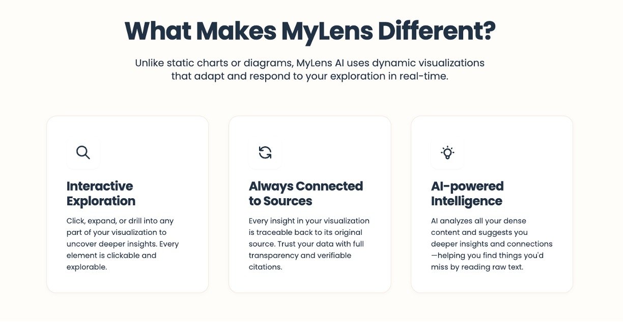 MyLens AI makes tough information easy by turning messy text, files, and data into interactive visuals you can explore with a click. No design skills needed – just upload your stuff like PDFs, YouTube links, or spreadsheets, and it instantly creates mind maps, timelines, or charts that show what matters most. Perfect for busy people who want to understand and share ideas fast, with every detail linked back to your original sources for total trust.