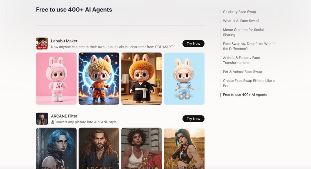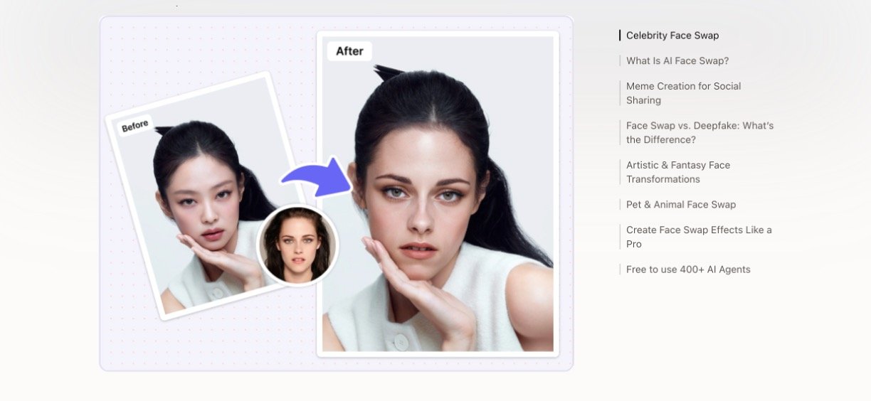 Supports celebrity face swaps, pet and animal face swaps, meme creation, and fantasy transformations.