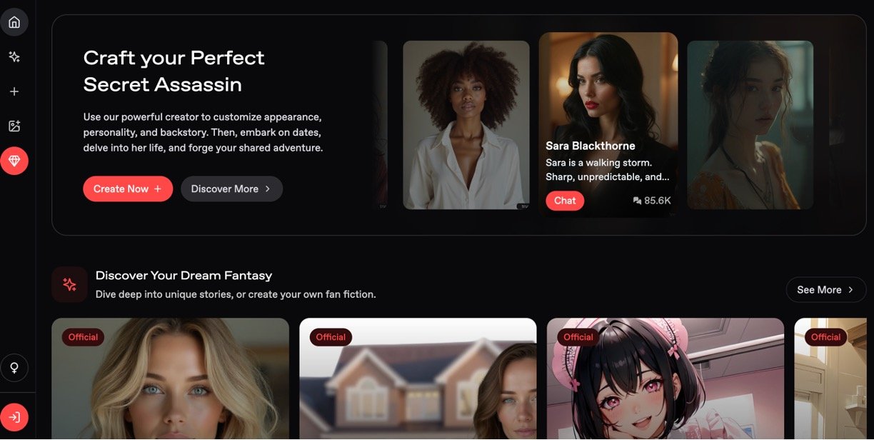 • Users create virtual AI friends or partners for conversation, companionship, and roleplay.