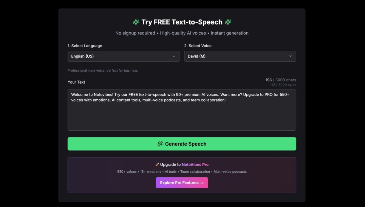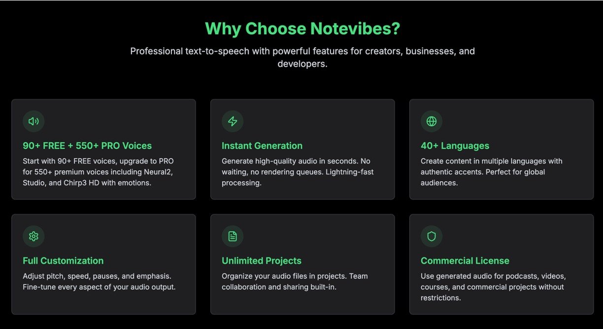 Notevibes is a powerful AI-driven text-to-speech platform that instantly converts written content into high-quality, human-like audio. Designed for content creators, educators, marketers, and businesses, it offers a vast library of free and premium voices with advanced control over emotions, pitch, speed, and emphasis to produce engaging narrations, podcasts, audiobooks, and voiceovers. Its easy-to-use interface supports importing text from PDFs, URLs, documents, images, and videos, making it simple to convert large amounts of content without recording equipment. With commercial use rights, team collaboration features, and lightning-fast processing, Notevibes is a versatile solution for professional audio generation.
