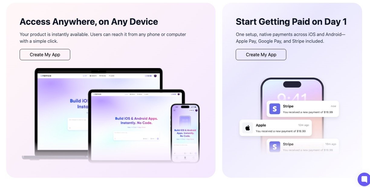 Instant app availability across platforms with native payments support including Apple Pay, Google Pay, and Stripe.