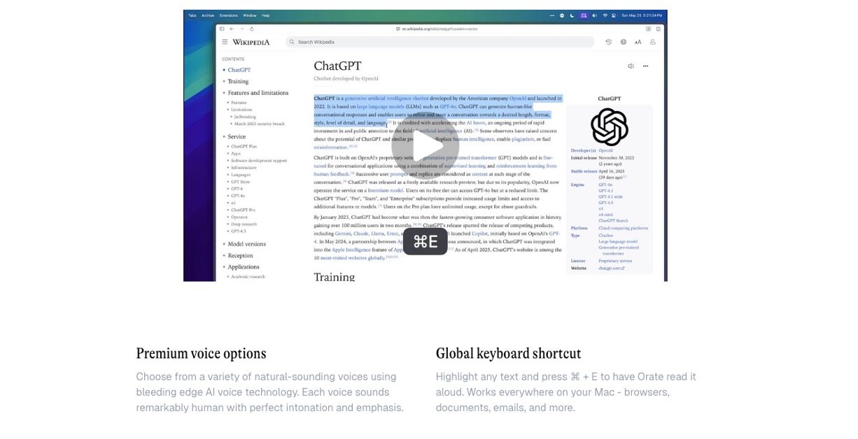 Orate is an easy-to-use AI-powered text-to-speech tool designed to read aloud any selected text instantly on your Mac. With just a keyboard shortcut, Orate transforms written content into natural, human-like speech using advanced AI voice technology that captures perfect intonation and emphasis. It works seamlessly across browsers, documents, emails, and more, allowing users to listen to text instead of reading it, enhancing productivity and accessibility.