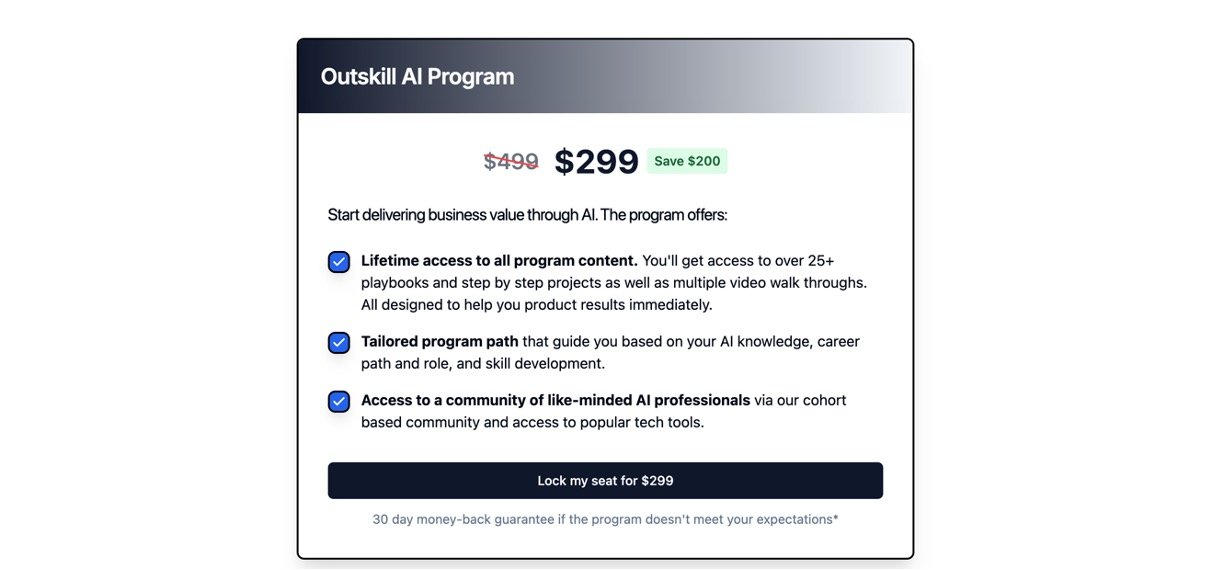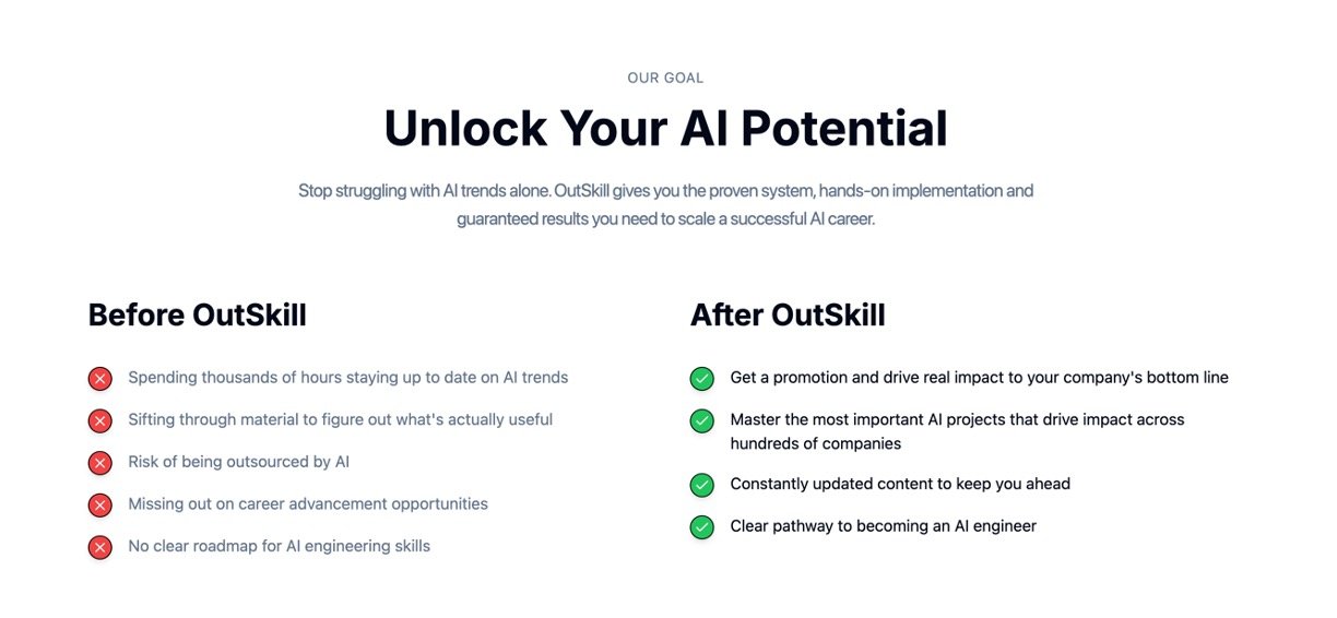Outskill.ai offers a personalized six-week AI training program designed to match individual skills and backgrounds. The course aims to help learners advance their careers by mastering practical AI skills applicable in real work environments. It focuses on hands-on experience, empowering users to build real-world AI applications and prototypes, making AI knowledge accessible even for those with little prior technical expertise. This program is supported by expert mentors and flexible online learning options to accommodate different learning paces.