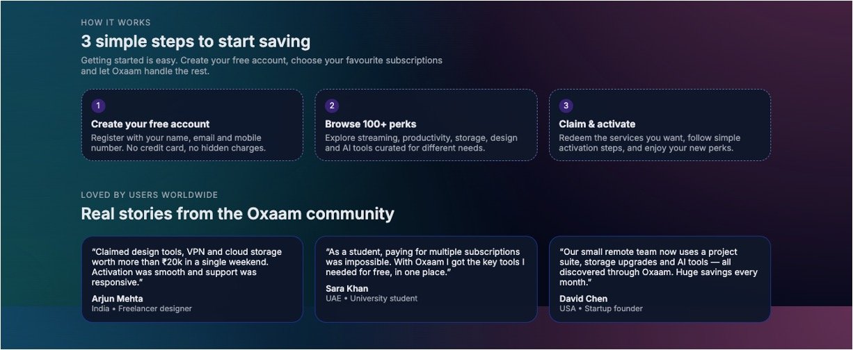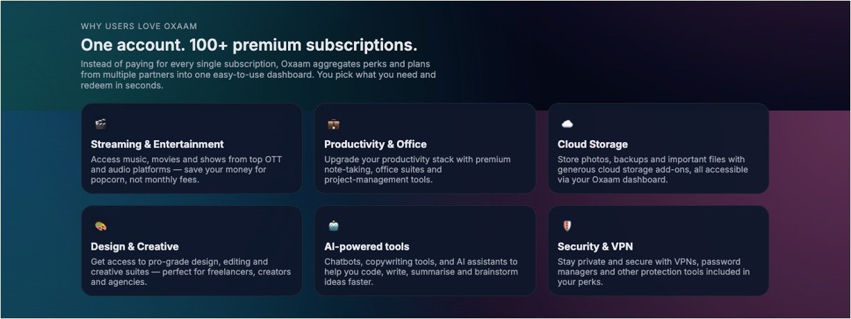 Oxaam is a world-leading free digital marketplace that gives you instant access to over 100 premium apps, tools, and subscriptions at zero cost. No credit cards, hidden fees, or strings attached – just sign up with your email and mobile, pick what you need like AI assistants, streaming services, cloud storage, and design suites, and activate them in minutes to supercharge your digital life. Users worldwide love it for saving thousands on pro-level tools while keeping things simple and secure.​