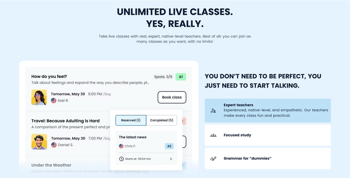 Unlimited live classes with experienced, native-level teachers in small groups for real-time feedback and authentic conversations.