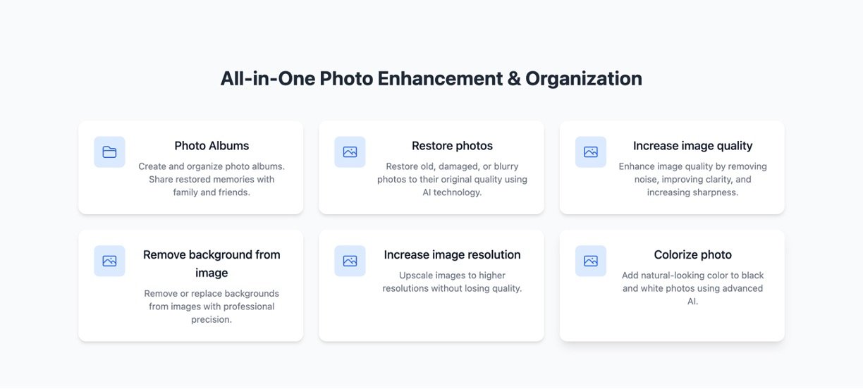 PhotoRestore is an easy-to-use online AI-powered photo restoration and enhancement platform designed to bring old, damaged, or low-quality photos back to life. Using advanced artificial intelligence, the tool can restore scratches, tears, and blurriness while also enhancing image quality by removing noise, sharpening details, and increasing resolution. It can colorize black and white photos with a natural look and even remove or replace backgrounds with professional precision. Users can organize restored images into photo albums and share precious memories easily, making it ideal for both personal and professional use without requiring technical skills.