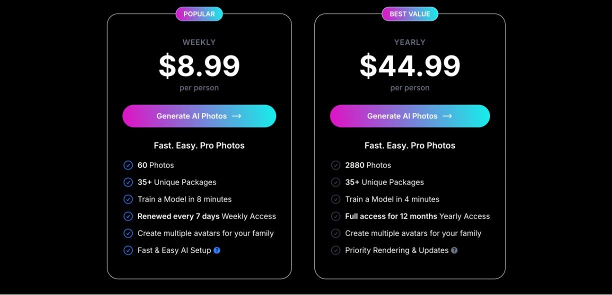 • Full commercial rights on all AI-generated photos for personal and business use.