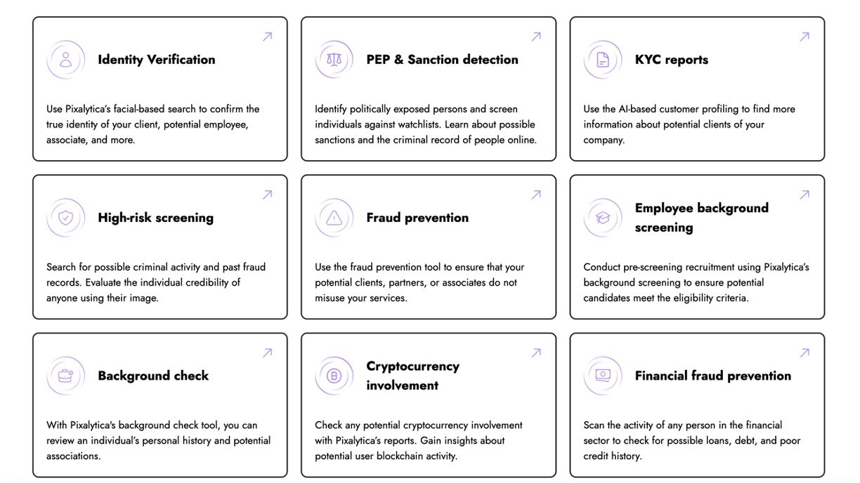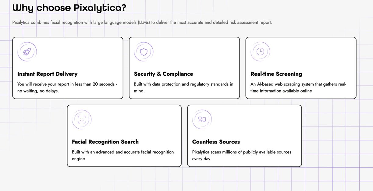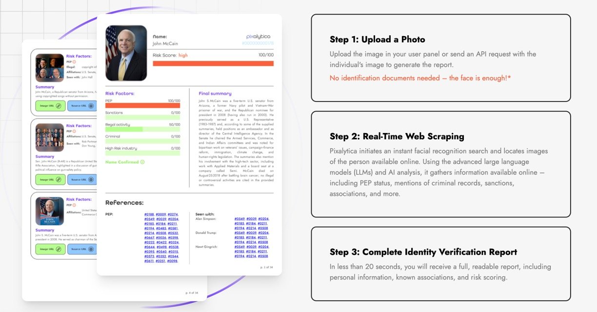 Pixalytica is a user-friendly AI tool that verifies identities without paperwork by scanning a photo with facial recognition technology. It searches millions of public web pages in real-time, using advanced AI models to pull together details like real names, risk scores, criminal links, and sanctions in under 20 seconds. Perfect for businesses wanting quick trust checks on clients, employees, or partners while staying compliant with privacy rules.