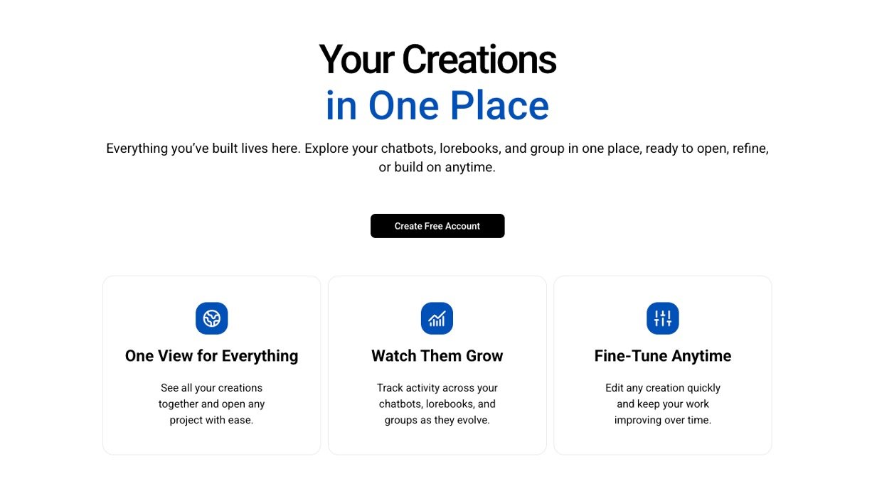 • Custom Character Creator: Design AI bots with personalities, backstories, and dialogue styles that match your imagination.