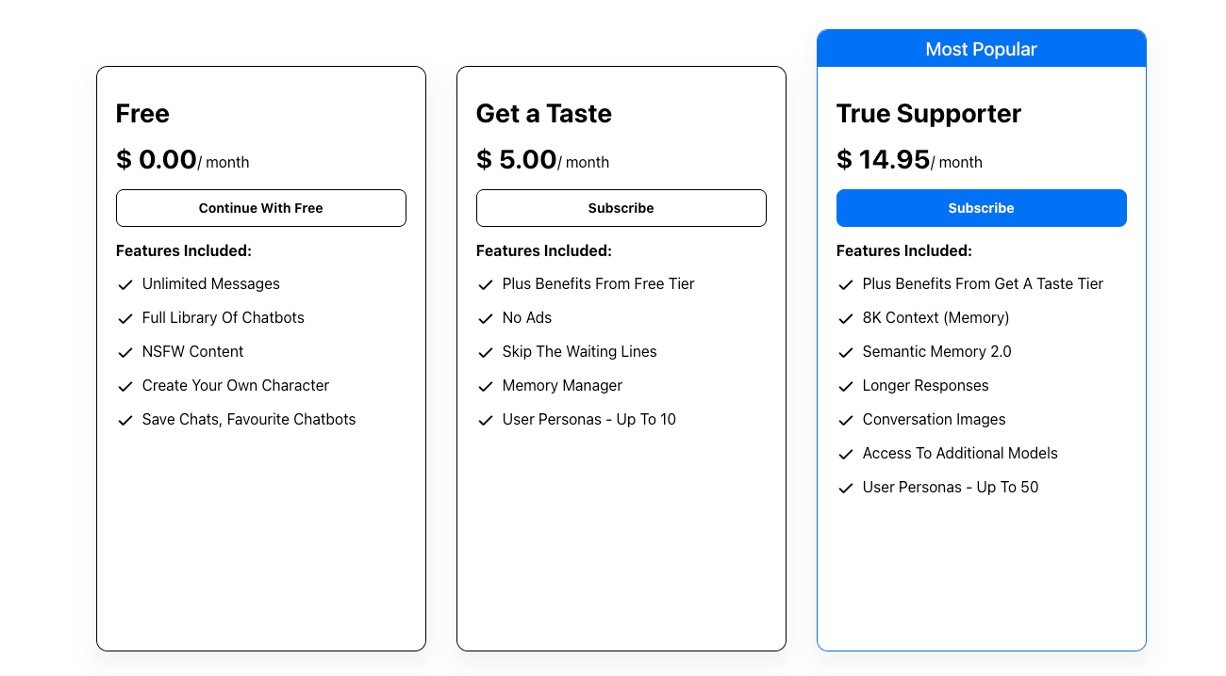 • Smart Memory System: Characters remember past chats (up to 16K context in premium), making talks feel natural and ongoing.