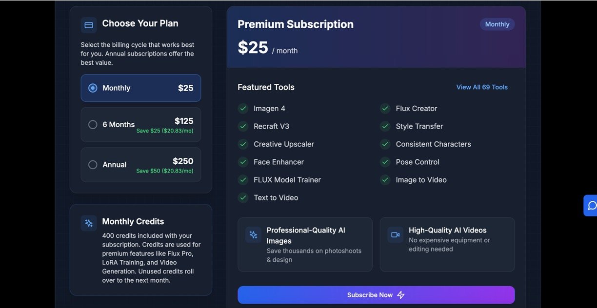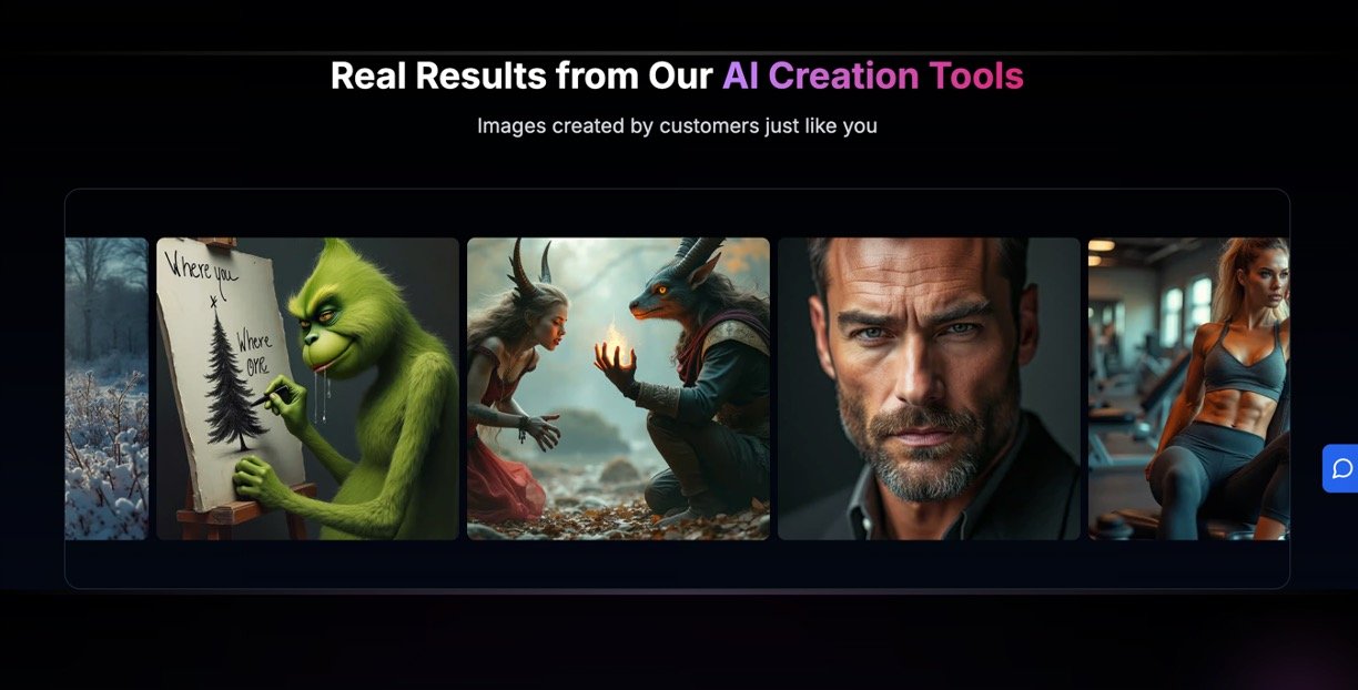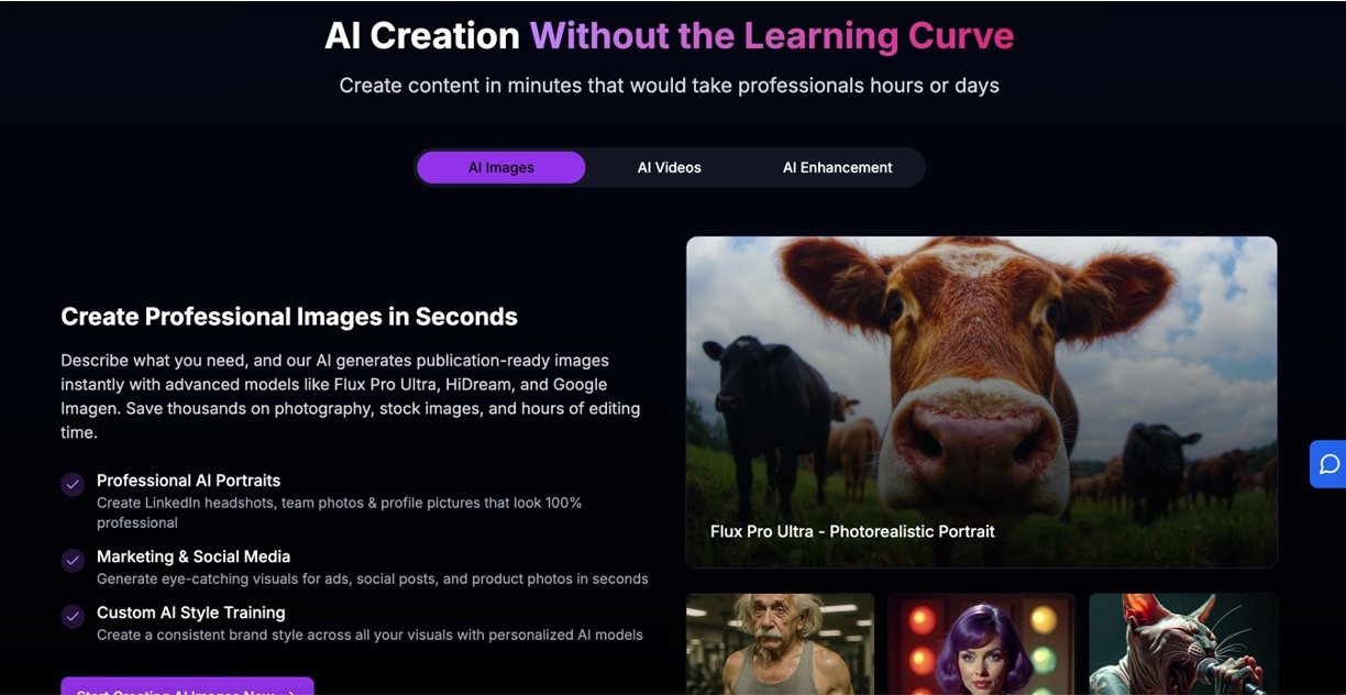 Instant AI image generation from text prompts with over 46 specialized AI tools like Flux Creator and Imagen 4.
