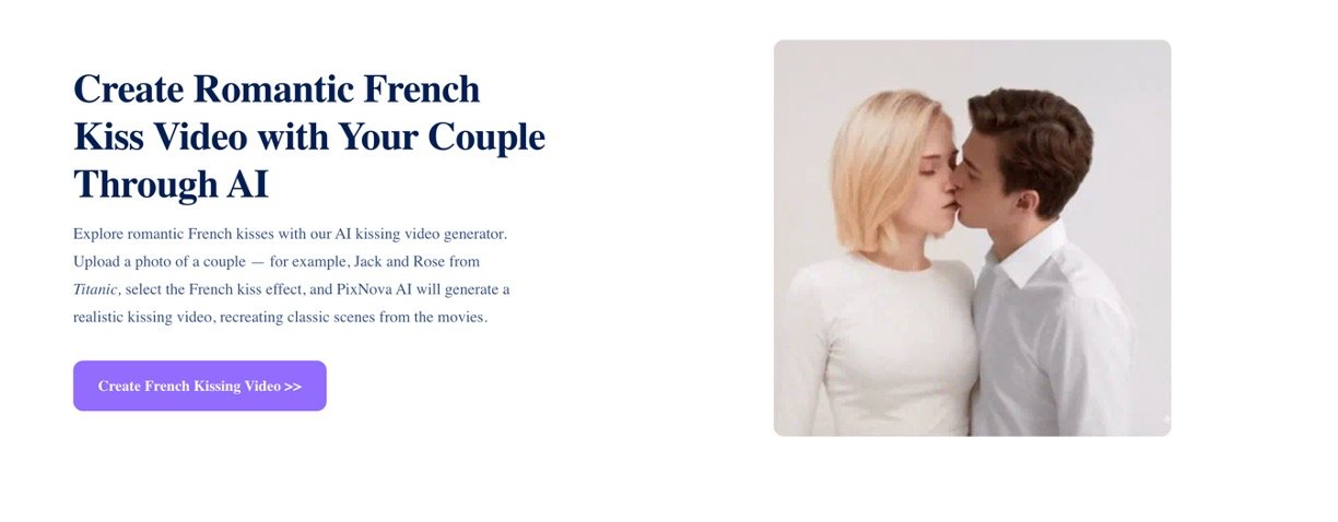 PixNova AI Kissing Video Generator turns your photos into romantic kissing animations in seconds, making it easy for anyone to create heartfelt videos without editing skills. Imagine capturing a sweet kiss with your partner, pet, or even movie characters like Jack and Rose from Titanic – all without a camera. PixNova AI Kissing Video Generator lets you upload one or two clear photos and instantly creates smooth, realistic kissing videos. It's perfect for fun memories, with options for French kisses, gentle pecks, or dramatic scenes set in sunny days or cherry blossoms, and it's completely free to start.