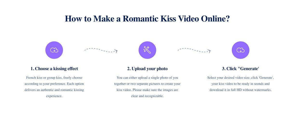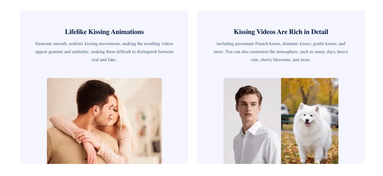 Upload a single photo or two separate images (like you and your pet) to generate dynamic kissing animations.