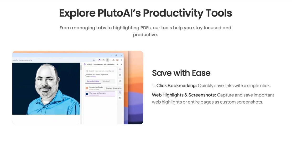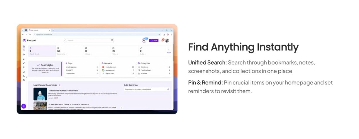 PlutoAI simplifies your online life by turning chaotic browsing into organized, AI-powered productivity. PlutoAI is your friendly browser companion that helps manage tabs, bookmarks, highlights, and notes effortlessly. It uses smart AI to auto-organize your saved web content, so you stay focused without the clutter. Perfect for anyone who juggles lots of online info daily, it keeps everything searchable and secure in one spot.