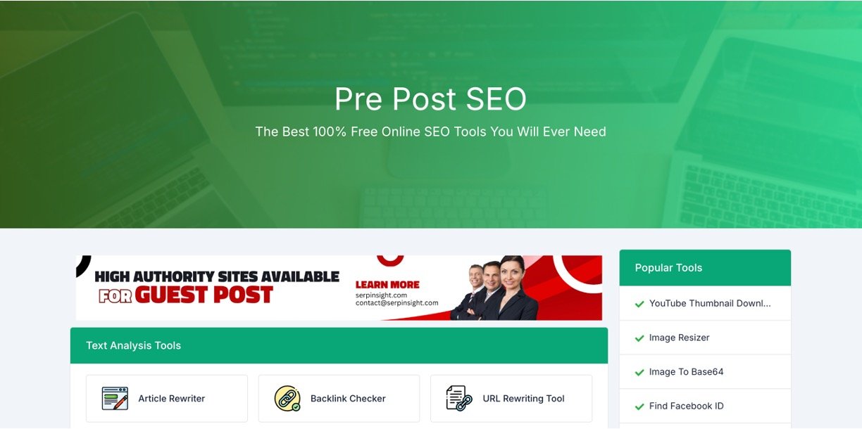 Pre Post SEO is a comprehensive online platform offering a vast collection of free SEO and content optimization tools designed to help users effortlessly improve their website performance, content quality, and search engine rankings. With over 150 specialized tools, it caters to webmasters, students, educators, writers, and SEO professionals by providing easy access to plagiarism checkers, article rewriters, grammar checkers, backlink analysis, image compressors, keyword tools, domain checkers, and much more—all in one user-friendly environment. It simplifies complex SEO processes and boosts online visibility even for users with minimal technical experience.