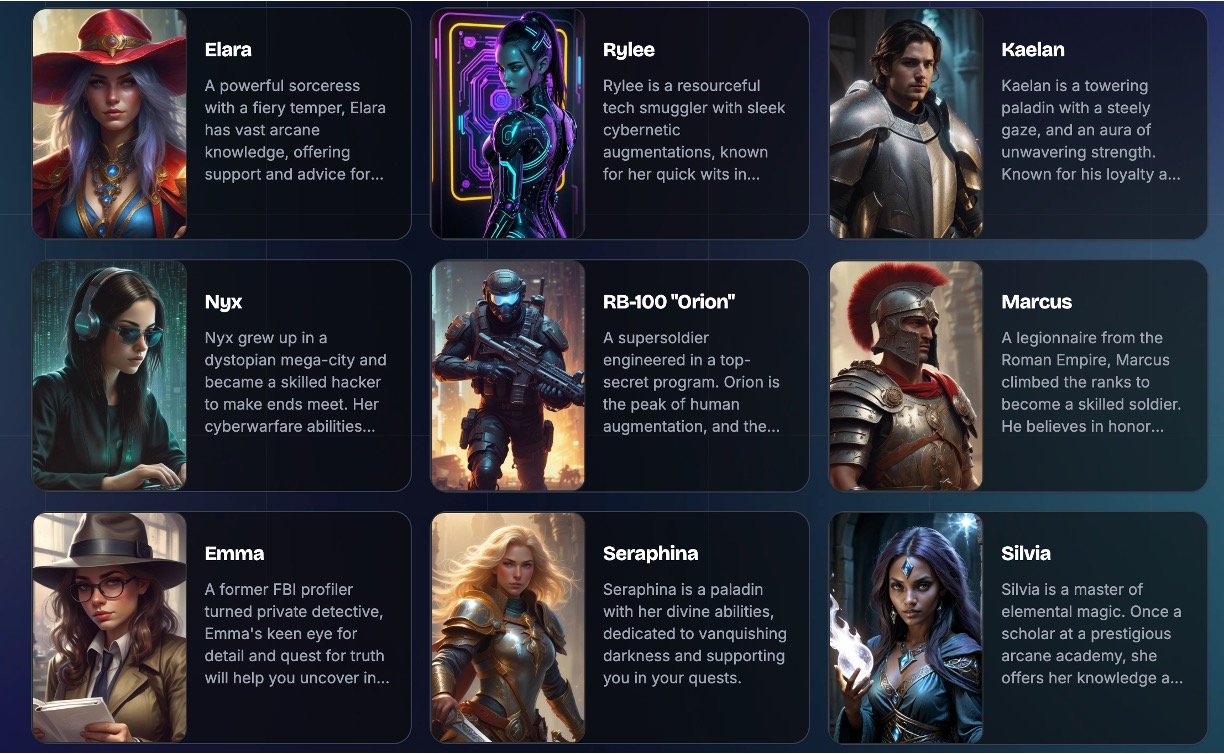 Fully customizable AI companions with unique personalities and detailed backstories.