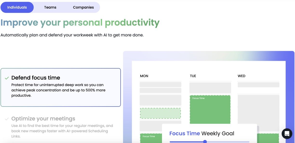 AI-powered smart scheduling that learns individual preferences and dynamically prioritizes tasks, meetings, and habits.