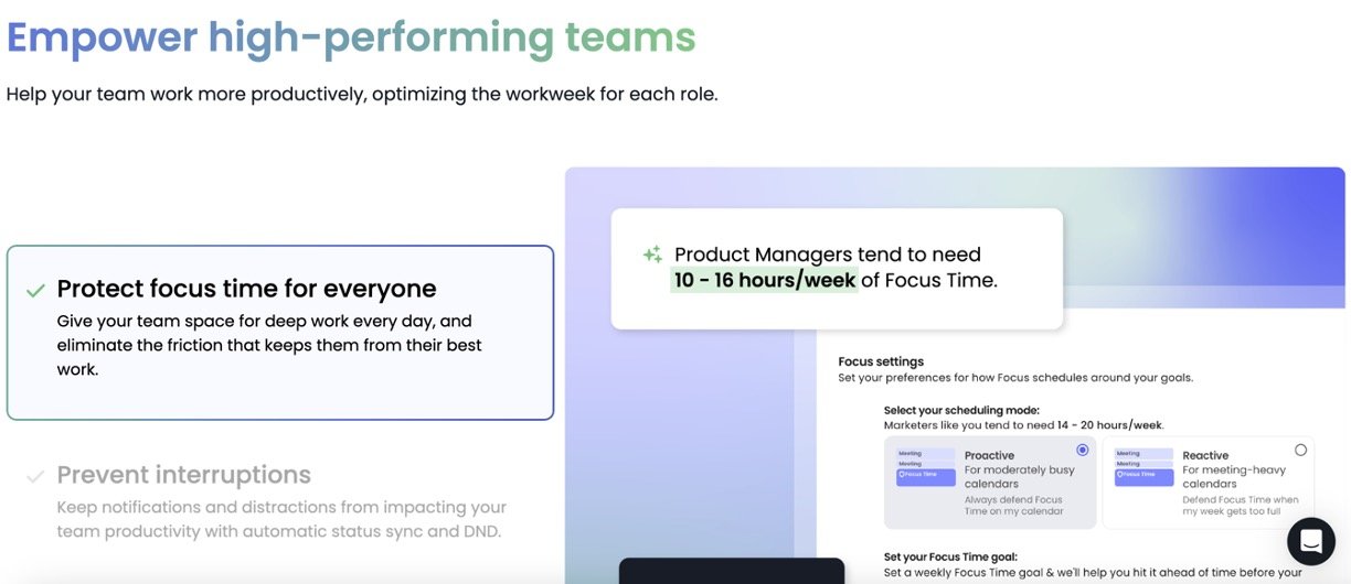Scheduling links for easy meeting booking, buffer time for breaks, no-meeting days, and time tracking for productivity insights.