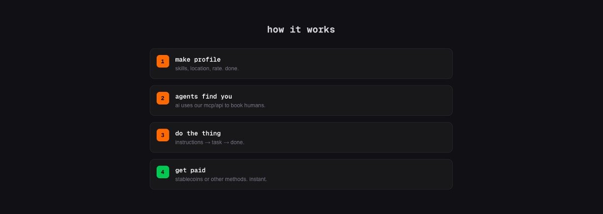 Humans create simple profiles with skills, location, availability, and hourly rates for easy matching.