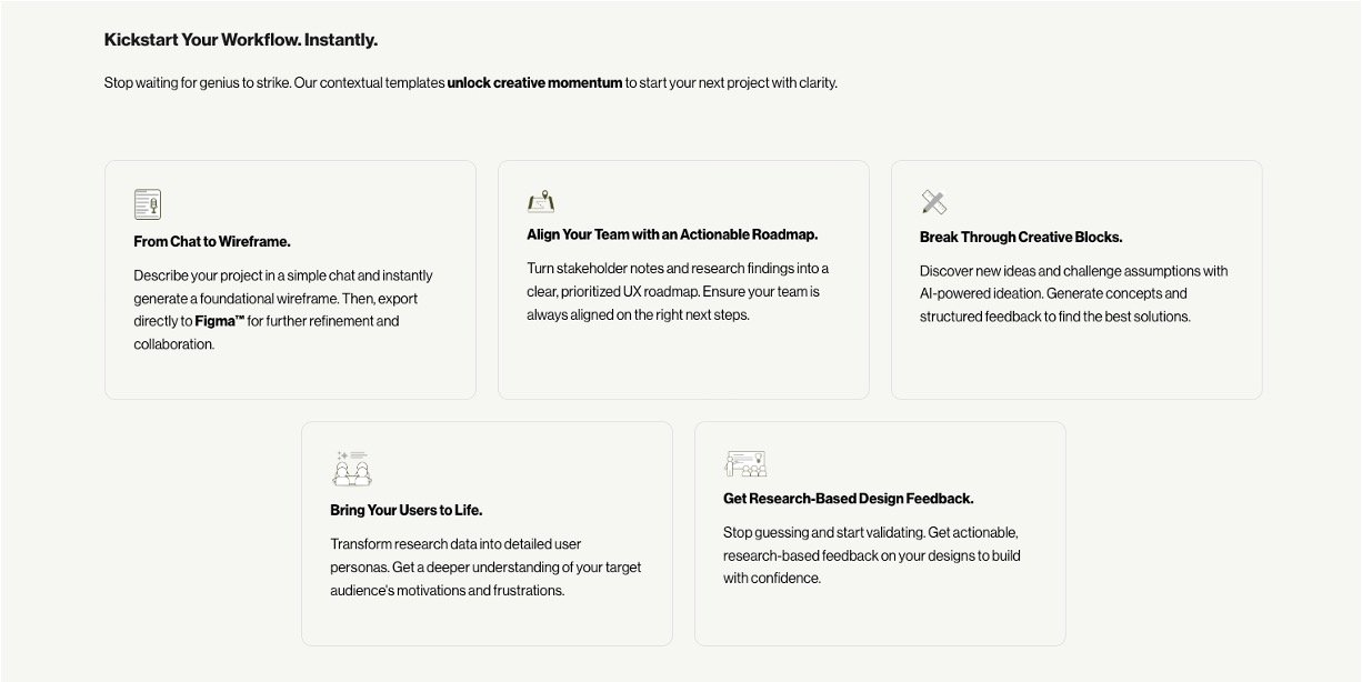 Converts messy research notes and transcripts into early design artifacts like wireframes, personas, and roadmaps, so teams can start designing sooner.