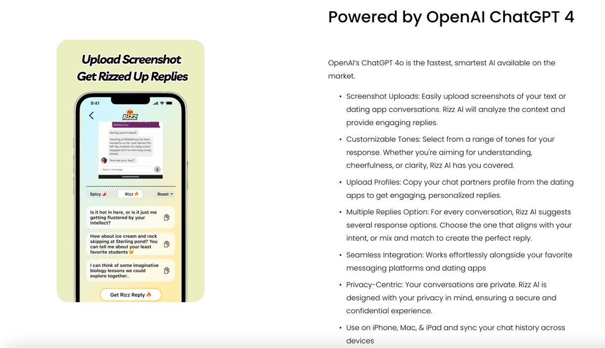 Customizable tone options with multiple reply suggestions per message to fit different moods (flirty, playful, serious).
