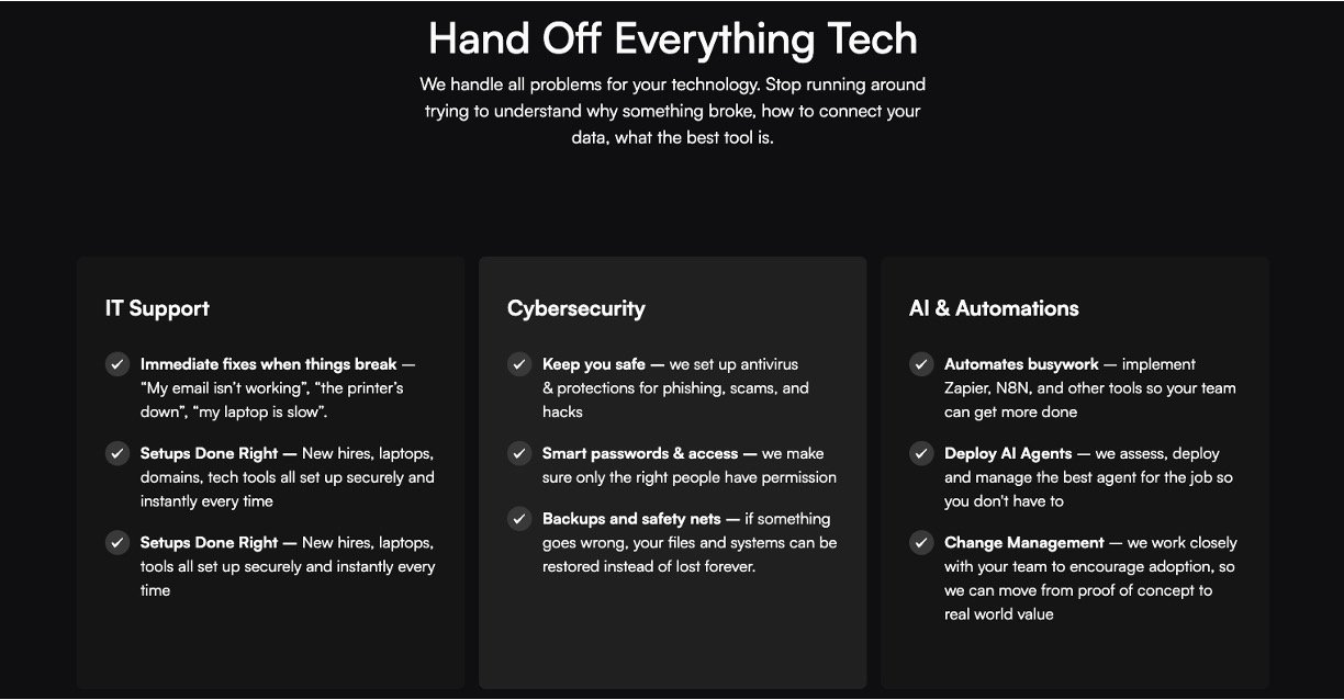 Done-for-you IT support – Fixes issues like email problems, slow computers, and broken printers as they happen, so your team can get back to work quickly.