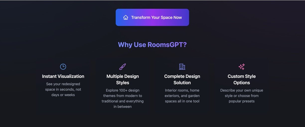 RoomsGPT is a comprehensive AI-powered design tool enabling users to transform any space quickly by uploading a photo and selecting from over 100 design themes. It caters to interior rooms, home exteriors, and garden spaces, providing professional-grade visualizations that help users visualize changes before actual renovations. RoomsGPT combines ease of use with high-quality AI-generated designs tailored to individual style preferences, making expert-level interior and exterior design accessible to everyone without the high cost of designers.