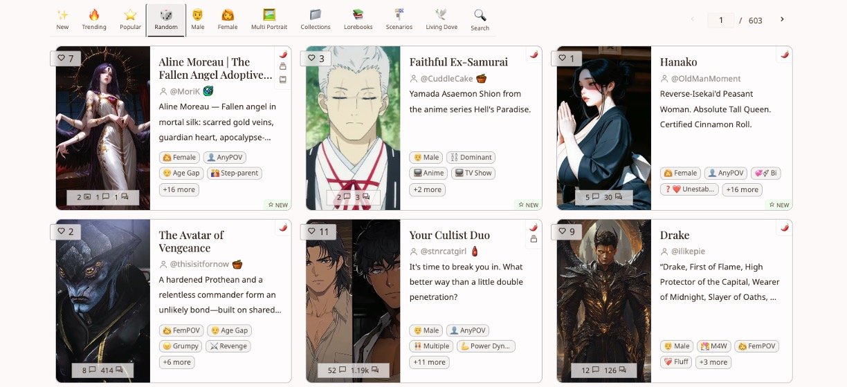 Explore flirty or spicy chats with male/female AI characters, complete with profiles and themes.