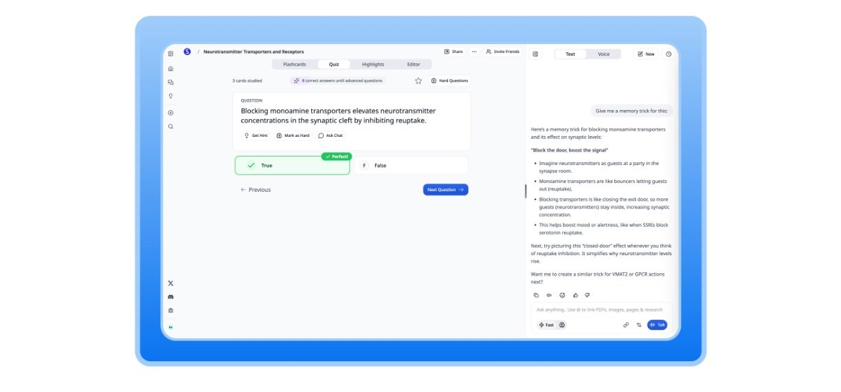 • Automatically creates flashcards and quizzes from PDFs, videos, and documents.