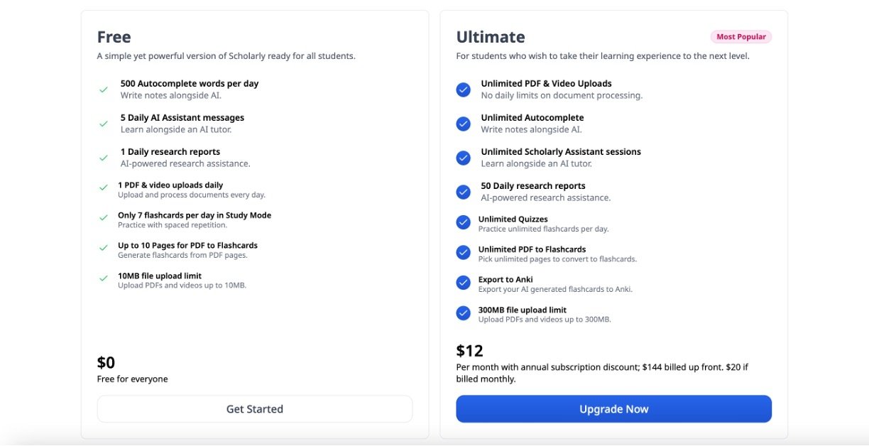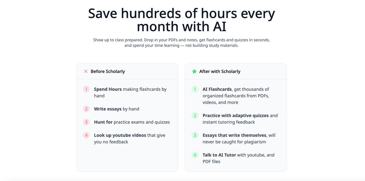Scholarly is an AI-powered study platform designed to transform learning by making study materials more accessible and manageable. It allows students to upload PDFs, videos, images, or text and automatically generates flashcards, quizzes, and study aids within seconds. With over 50,000 students using it, Scholarly features smart note-taking, interactive flashcards, deep research capabilities with AI-generated essays, and the ability to chat and query uploaded study materials like PDFs. Its adaptive quizzes provide instant feedback, making studying more efficient and personalized. Scholarly also offers tools like graph and diagram generation to aid comprehension.​
