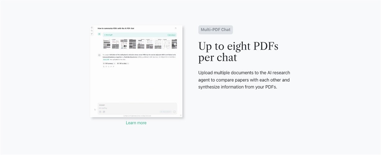 Multi-PDF chat: Upload up to 8 PDFs (120 pages/80MB each) to compare, summarize, and extract insights side-by-side.
