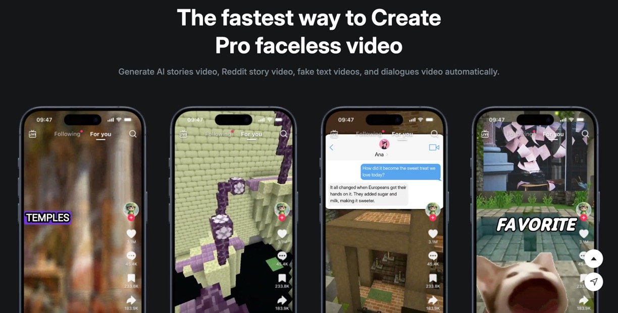 Faceless Channel Management: Enables users to run faceless YouTube or TikTok channels with automatic video creation and monetization.