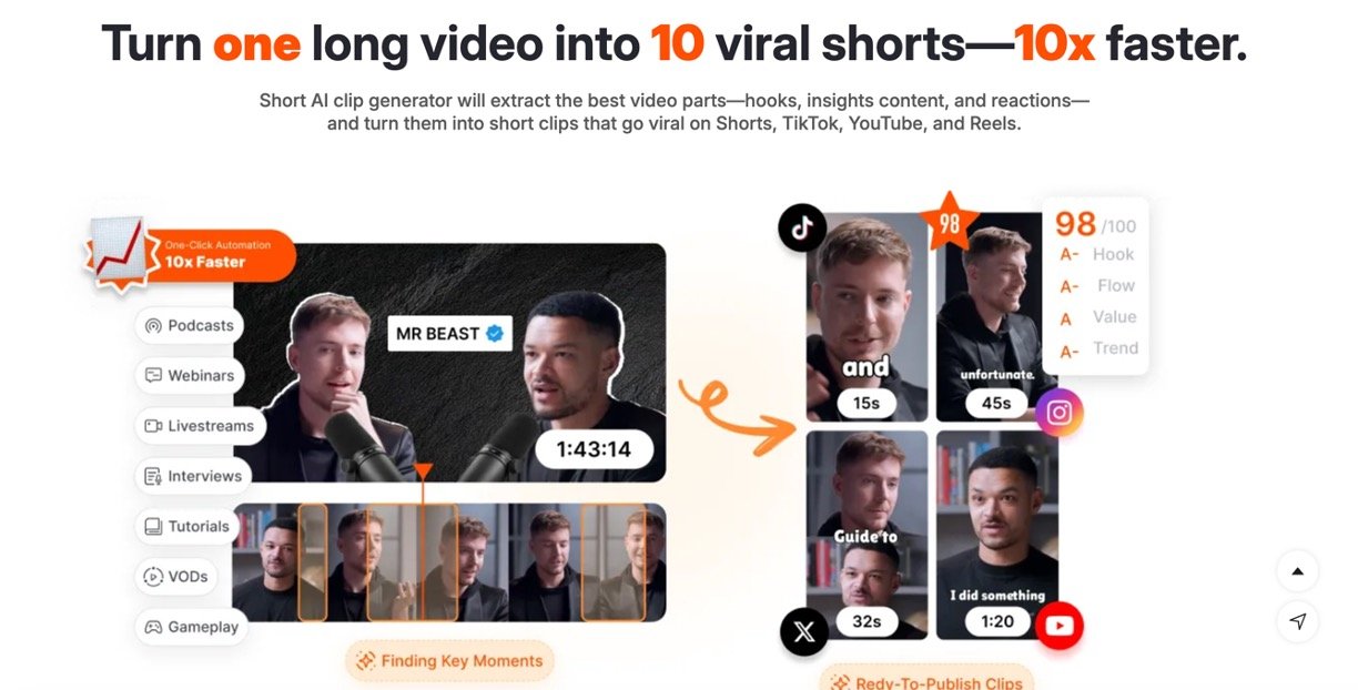 Content Repurposing: Converts long videos like podcasts, webinars, or tutorials into engaging clips for broader reach.