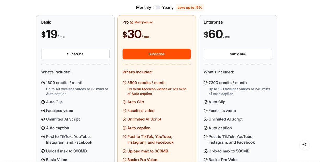 Faceless Video Creation: Generates subtitles, integrates stock footage, and produces engaging videos without showing the creator’s face.