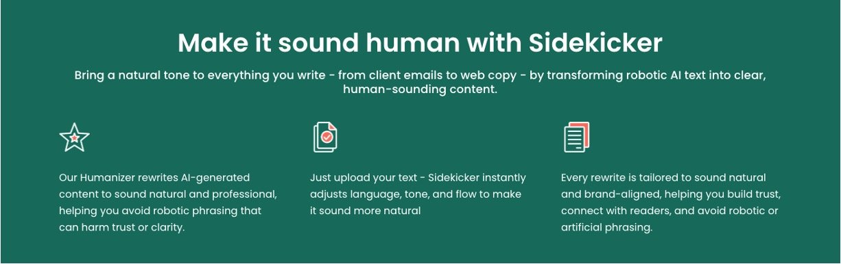 Sidekicker AI is an advanced AI writing assistant designed to transform AI-generated or robotic text into clear, natural, and human-sounding content. It combines three powerful tools: an AI Detector to identify machine-written text, a Plagiarism Checker to ensure originality by scanning billions of sources, and an AI Humanizer that refines drafts to maintain an authentic, professional, and brand-consistent voice. Sidekicker is ideal for professionals who want to maintain trust, clarity, and credibility in their written communications across reports, marketing materials, proposals, and more.