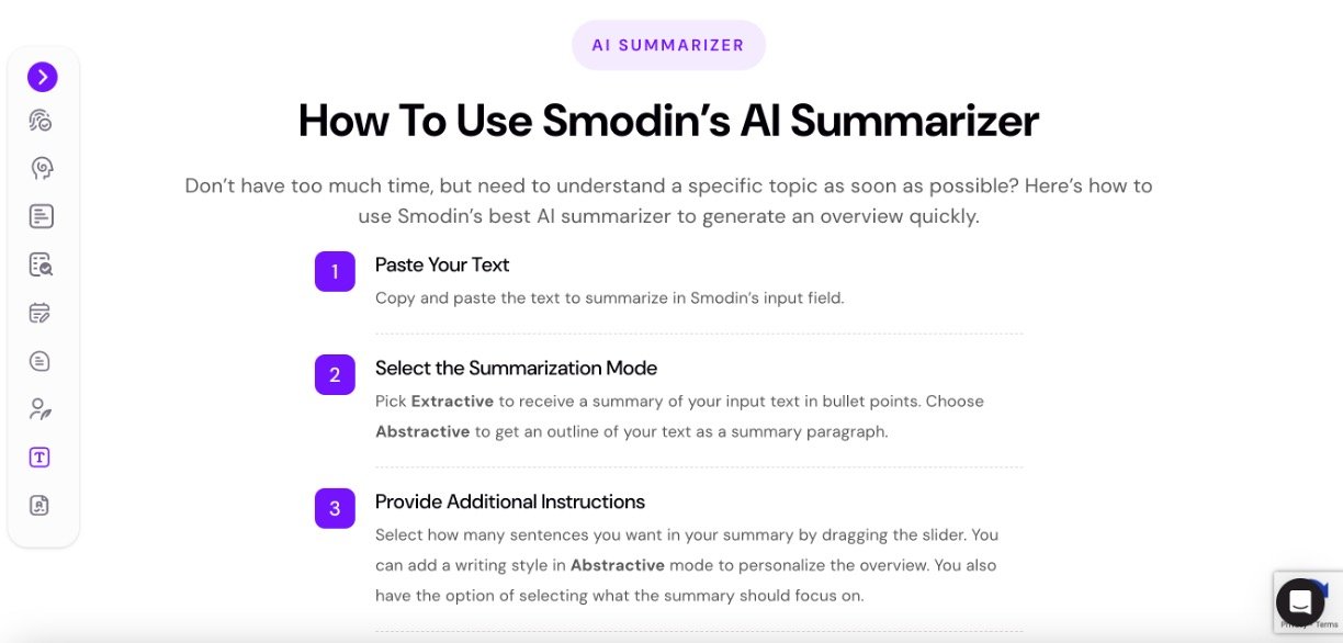 Smodin is an AI-powered text summarizer and writing assistant designed to help users quickly condense lengthy content into clear, concise summaries while preserving key points and meanings. It supports customizable summary lengths and formats, including bullet points, paragraphs, or a best-line summary, catering to different user needs. The platform provides multilingual support, text rewriting, plagiarism checking, citation generation, grammar correction, and translation services, making it versatile for students, researchers, writers, and professionals.