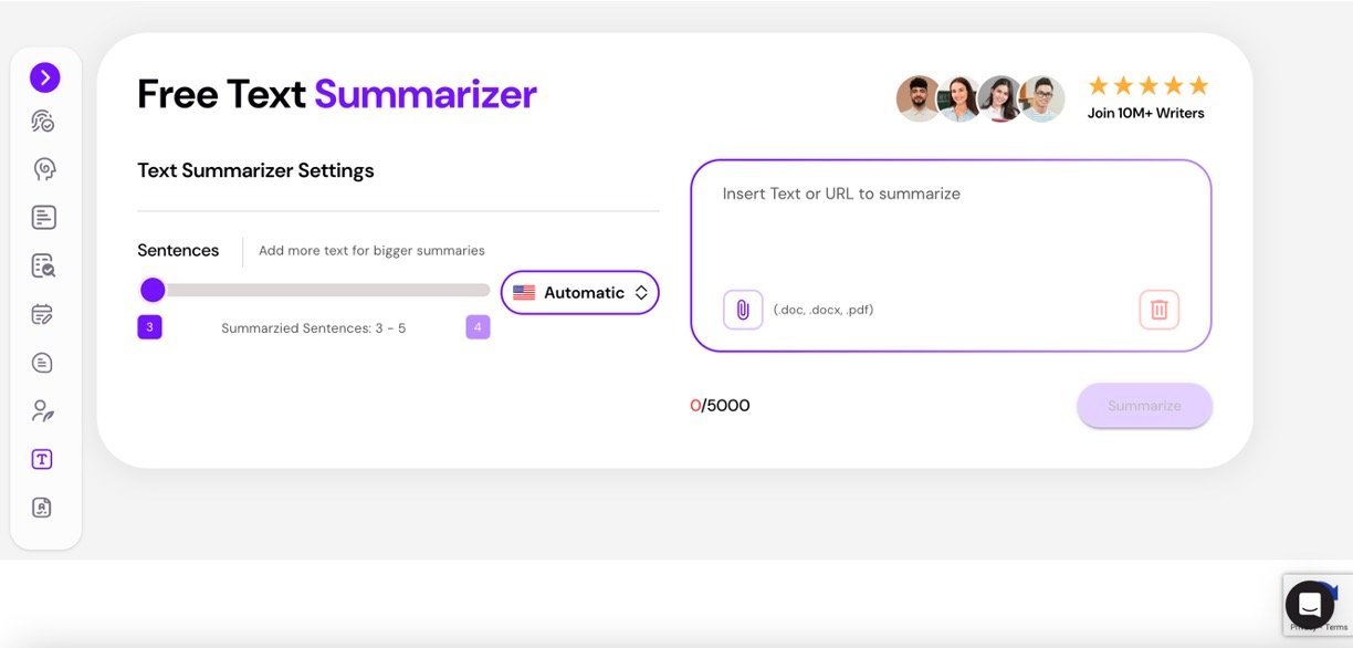 • Customizable summary length and style, with options for bullets, paragraph summaries, or best line.