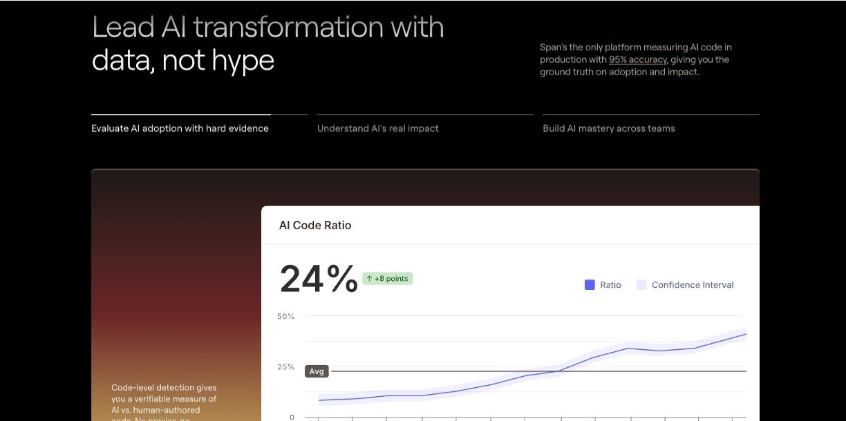 AI code detector (span-detect-1) identifies AI vs. human-written code across tools like Python, TypeScript, and JavaScript with 95% accuracy, tracking adoption and quality.