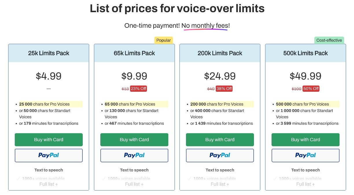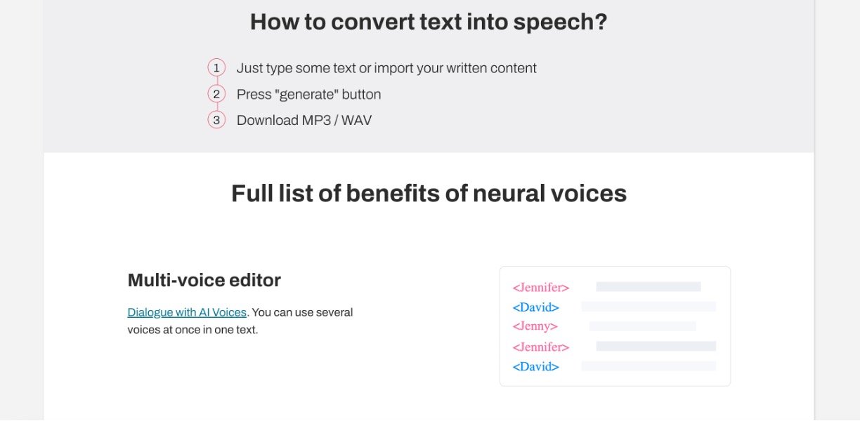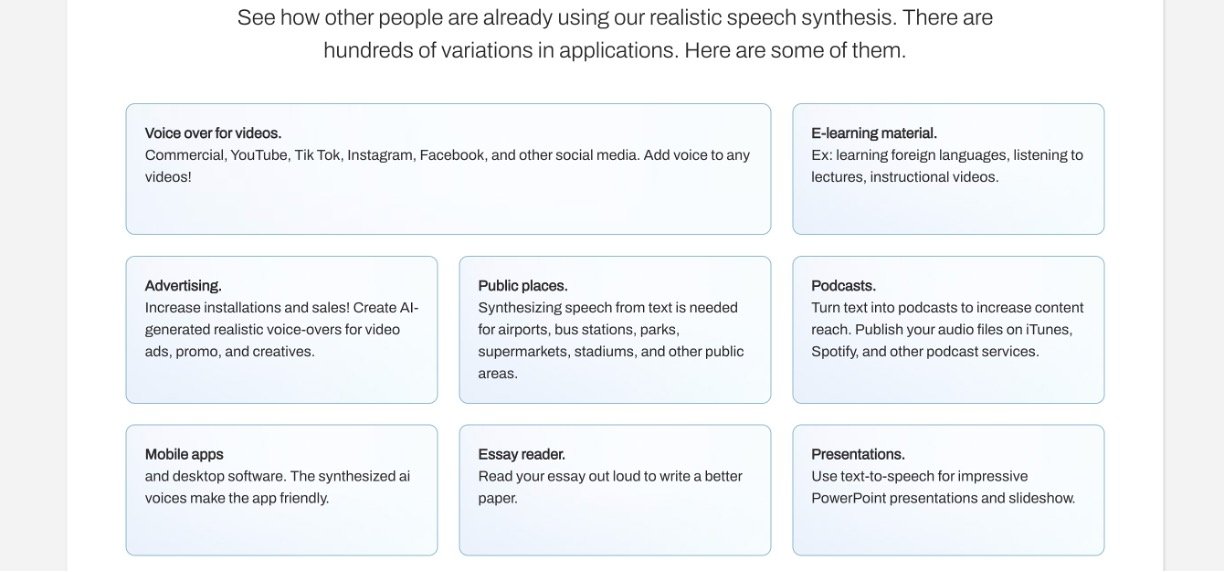 Over 1000 natural-sounding AI voices across 76+ languages and dialects, including male, female, child, and elderly voices.