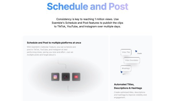 • Schedule & Post: Plans posts to TikTok, YouTube, and Instagram with optimized titles, descriptions, and hashtags at peak times.