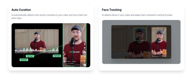 • Auto Curation: AI spots viral moments in your video and clips them automatically into shorts (1 credit per 20-minute video).