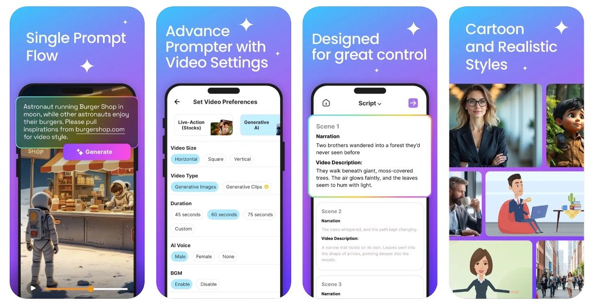 • Multiple video styles including animation, live-action, talking heads, and generative AI.