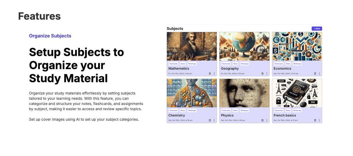 • Organizes study materials by subjects with AI-designed cover images for easy access.